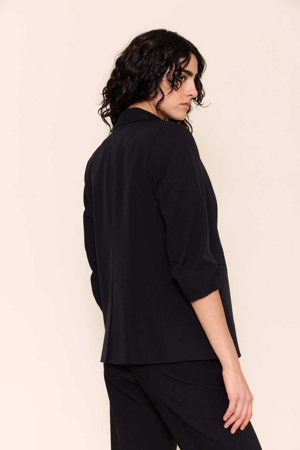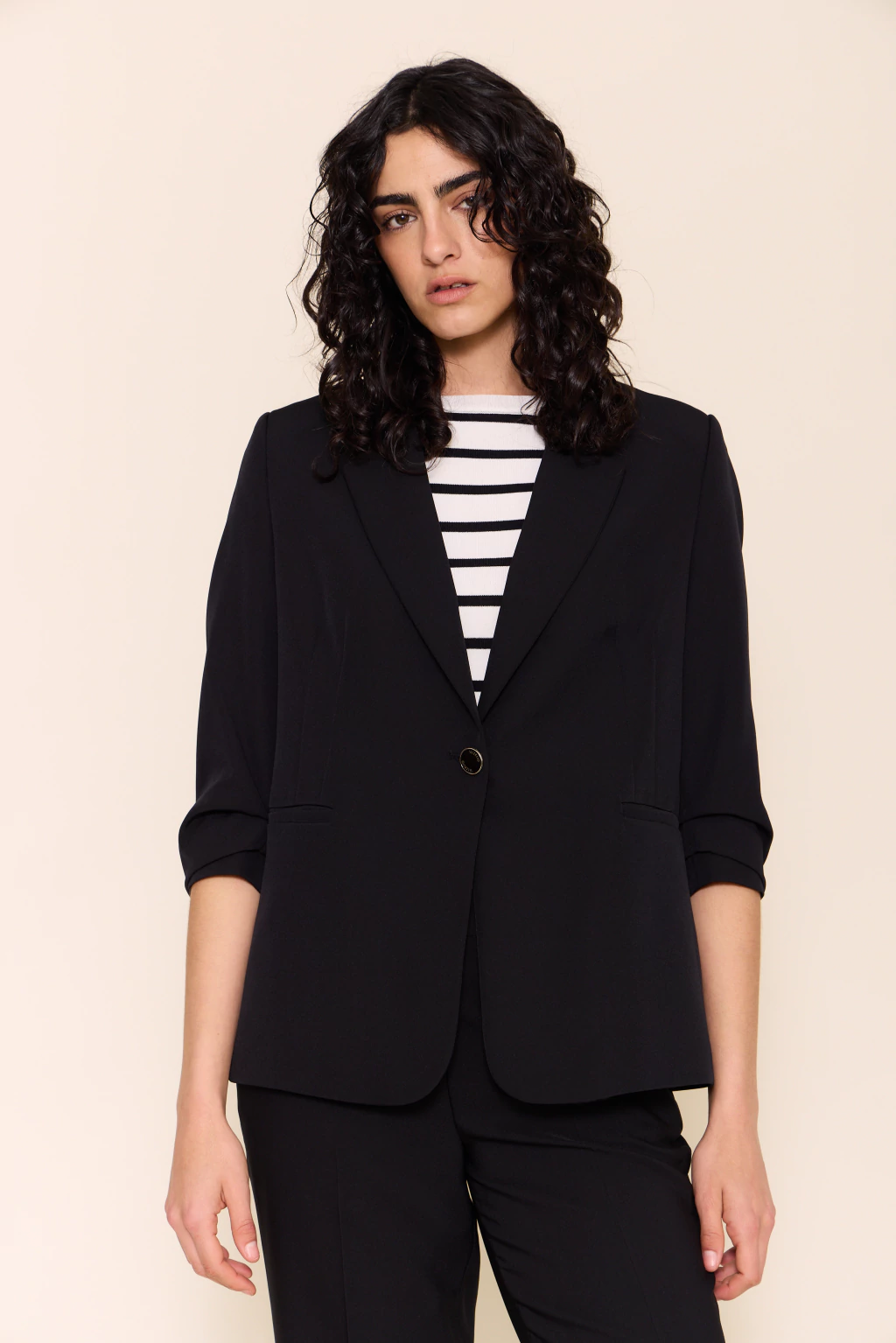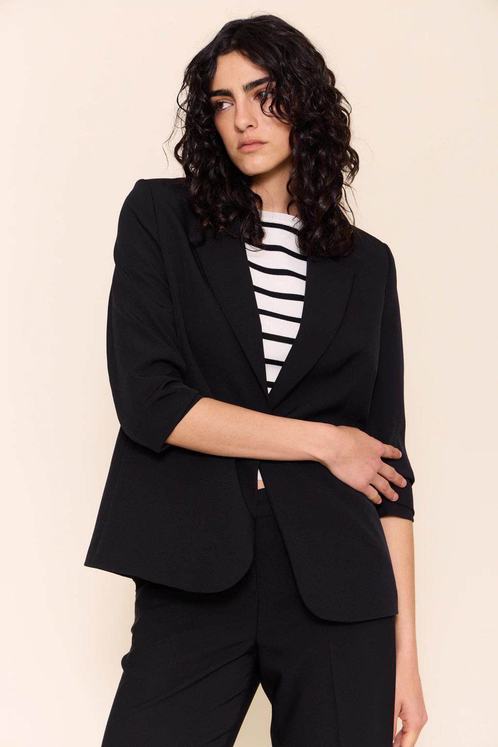 Blazer de corte clásico con solapa partida y bolsillos ojal. Acceso frontal con un botón que aporta elegancia sutil. Detalle de mangas 3/4 con frunce para un toque femenino y moderno. Una prenda versátil que eleva tu estilo y refleja tu esencia.