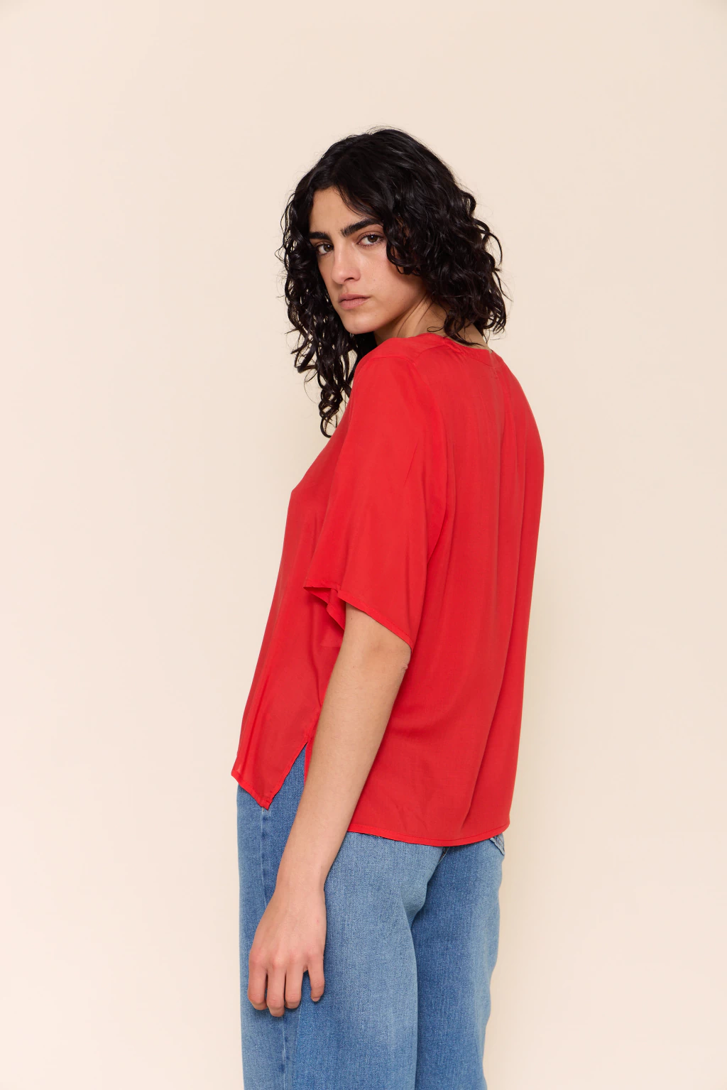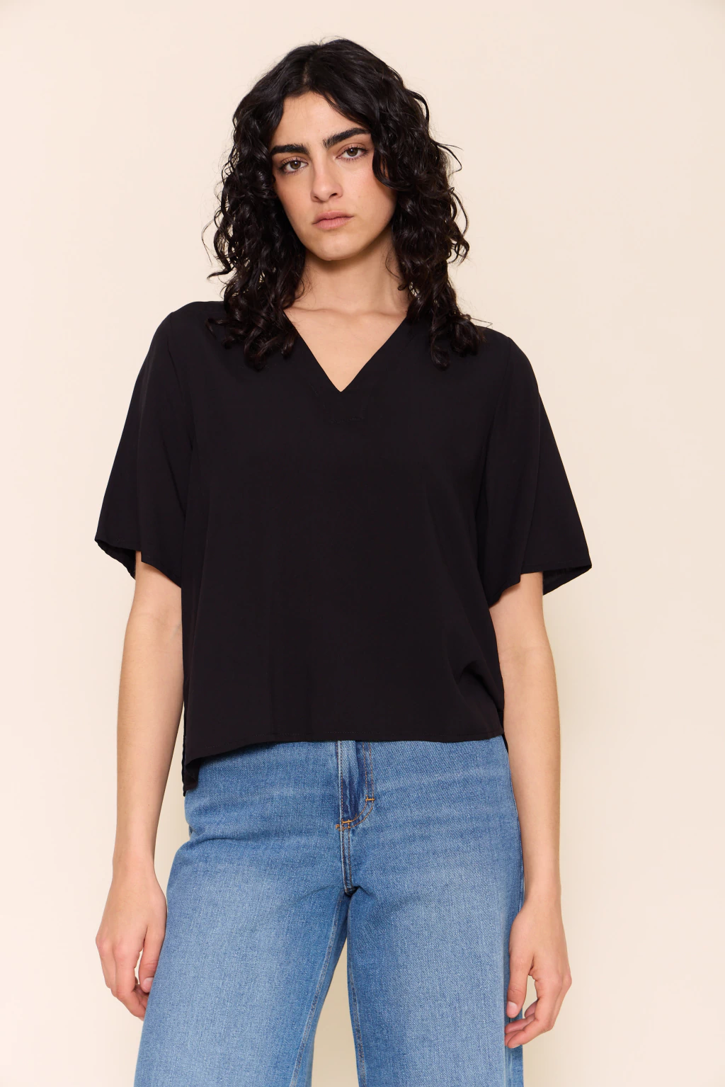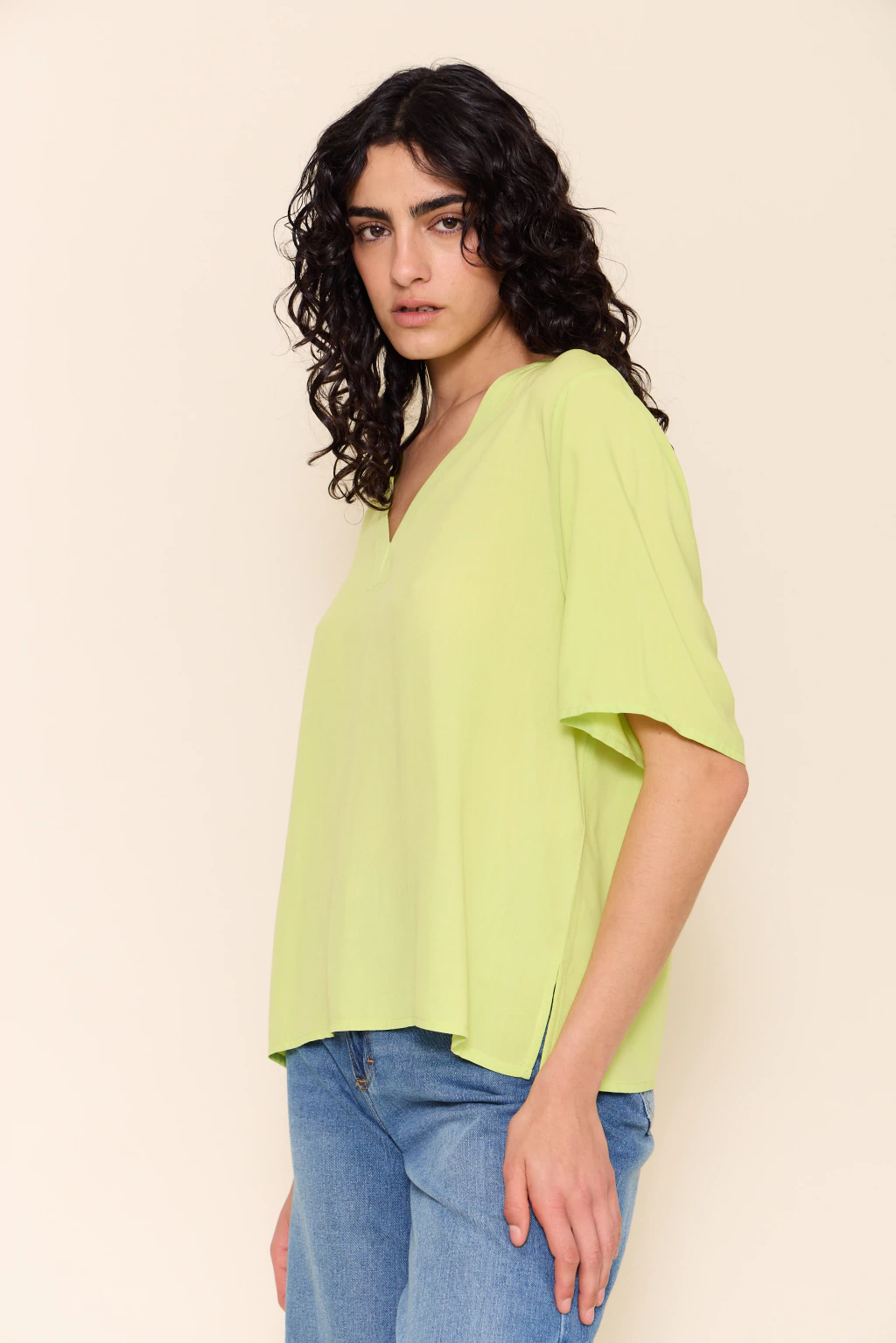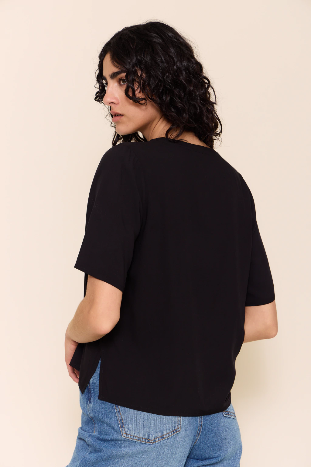 Blusa con escote en v y mangas cortas, diseñada con tajos laterales que aportan movimiento y frescura. su fit recto y holgado la convierte en una prenda cómoda y versátil, ideal para usar tanto en looks relajados como en combinaciones más elegantes.