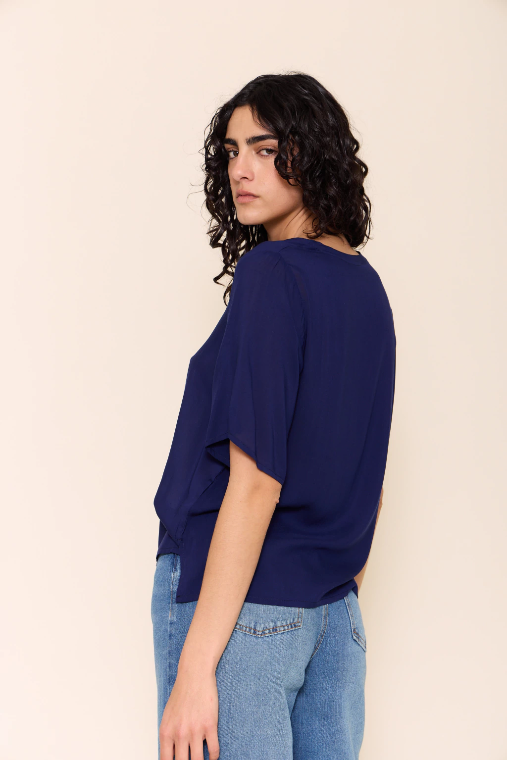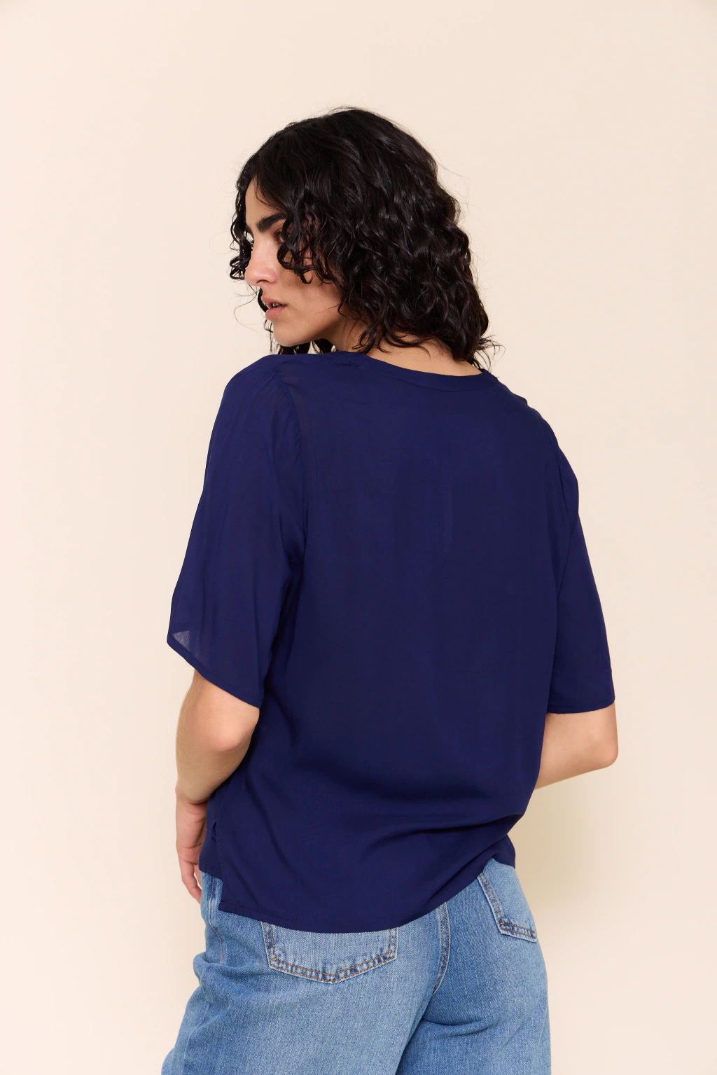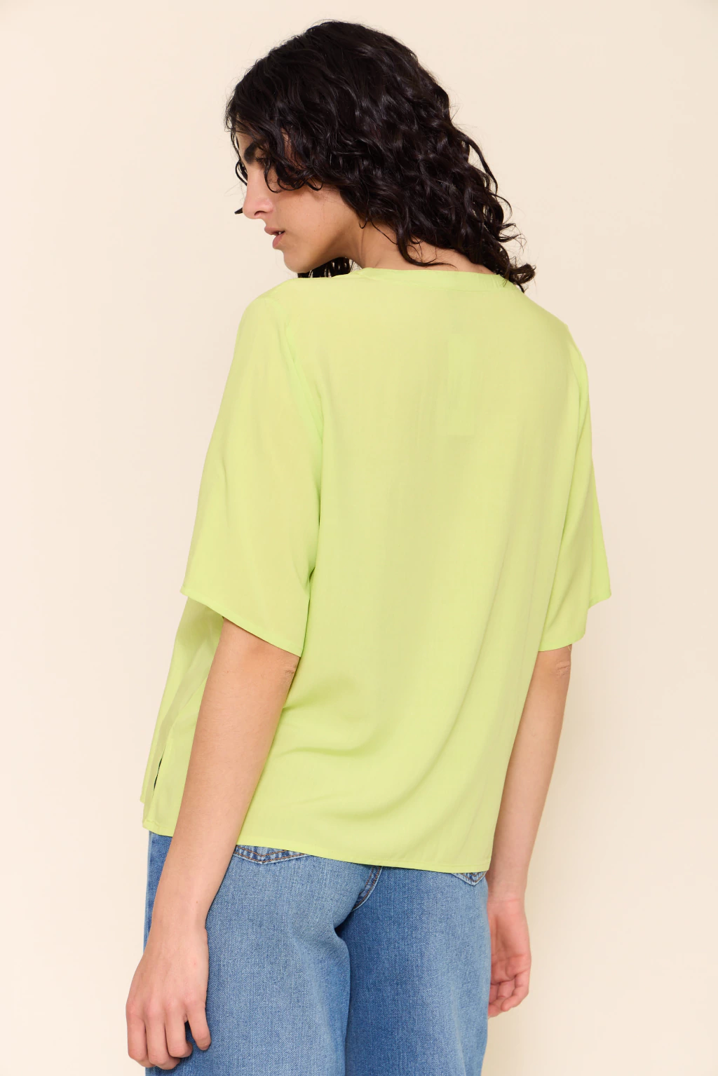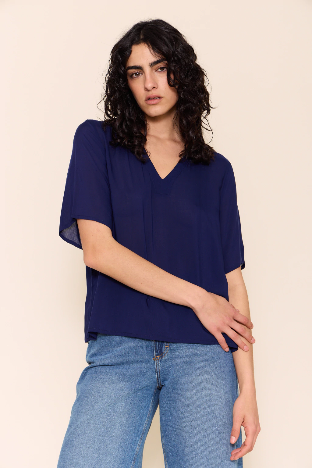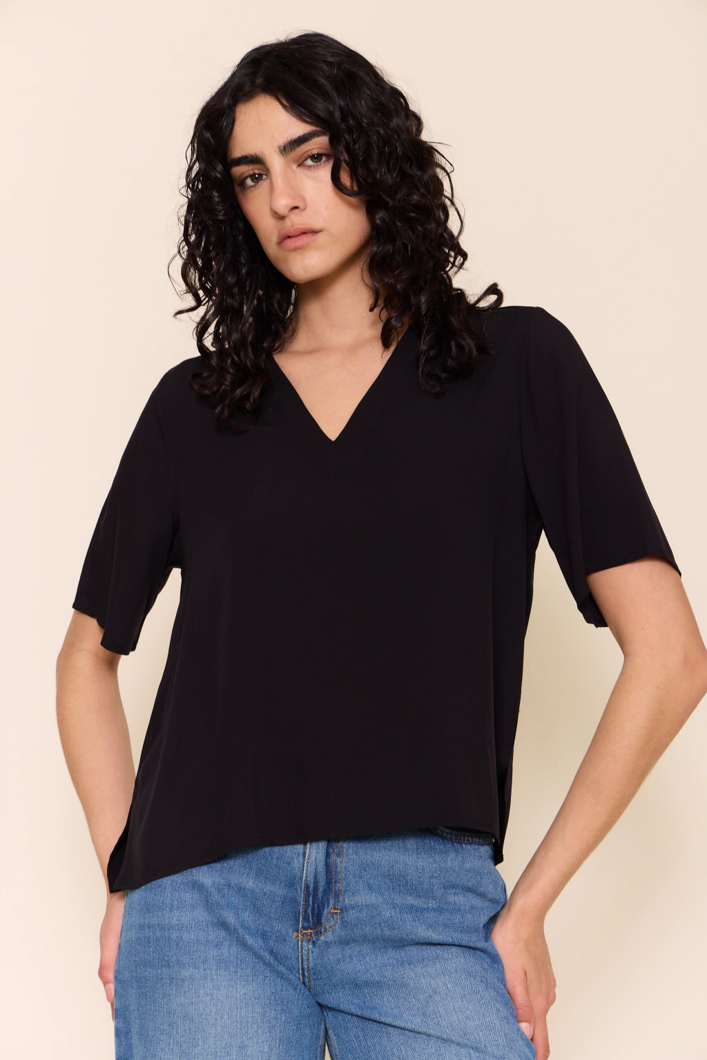 Blusa con escote en v y mangas cortas, diseñada con tajos laterales que aportan movimiento y frescura. su fit recto y holgado la convierte en una prenda cómoda y versátil, ideal para usar tanto en looks relajados como en combinaciones más elegantes.