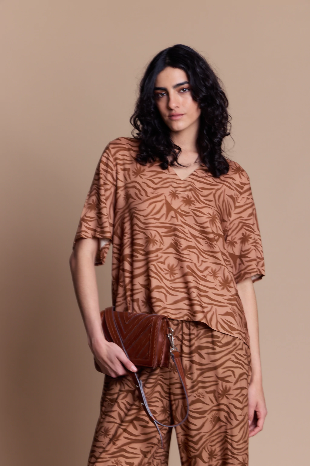Blusa estampada con escote en V, mangas cortas y tajos en los laterales que aportan comodidad y movimiento. De fit recto holgado, fresca y versátil, ideal para un look moderno y femenino.
