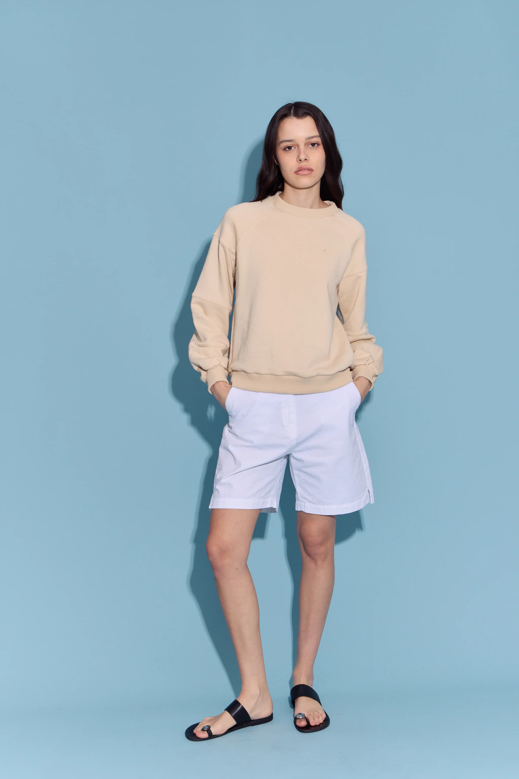 Buzo con escote a la base, mangas largas raglán con recortes y forma abullonada. Cuello, puños y cintura en ribb. Fit recto y holgado para un estilo cómodo y moderno.