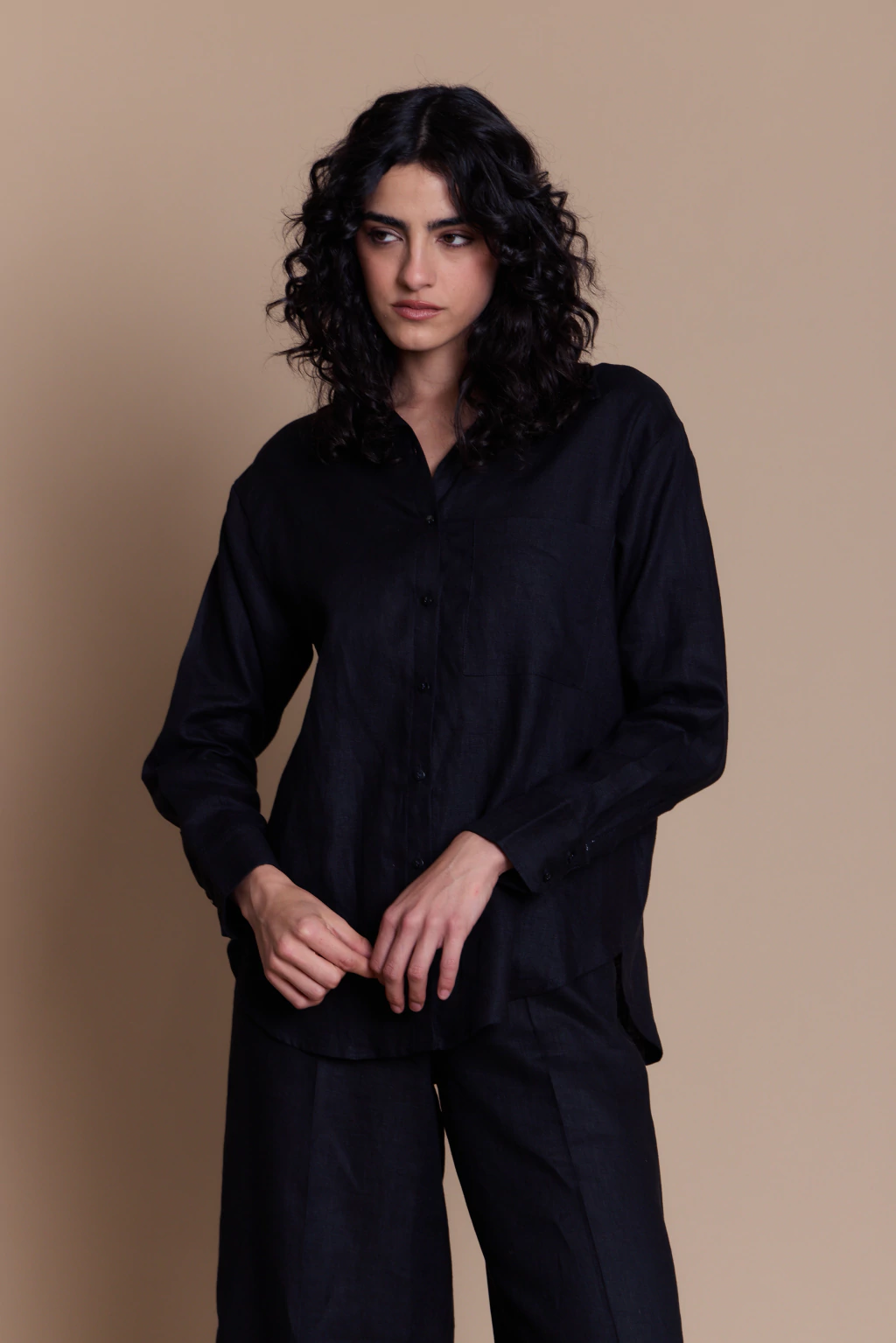 Camisa de lino 100% con hombros caídos, cartera con botones y puños con doble botón. Canesú en espalda y fit oversize holgado para un estilo relajado y moderno.