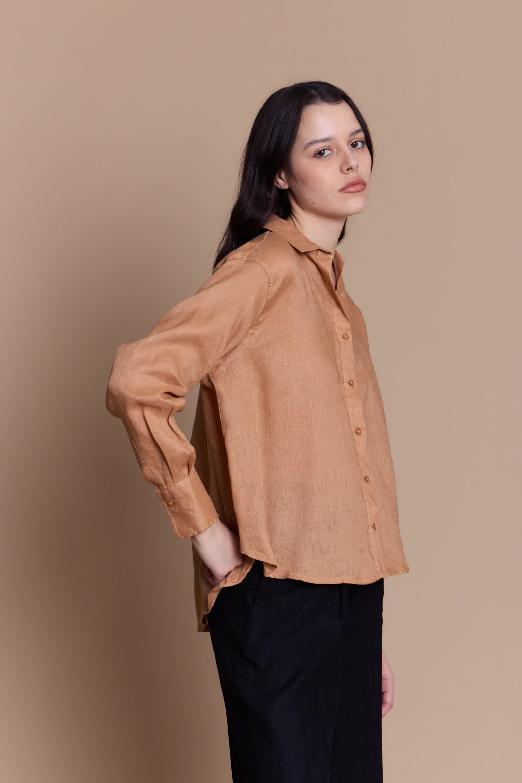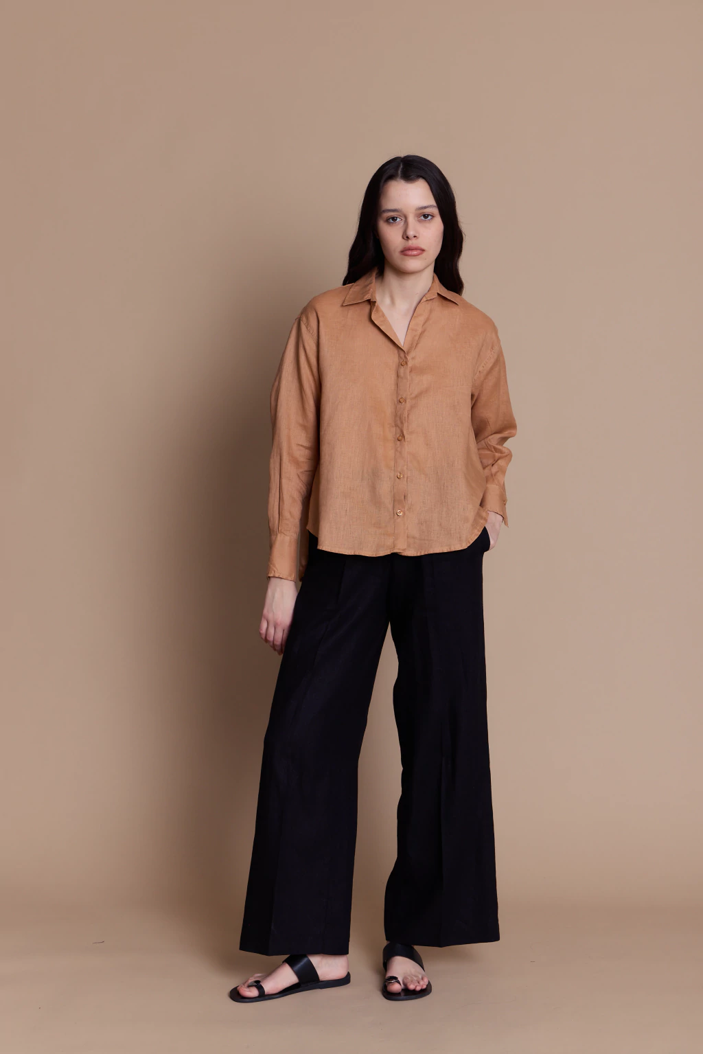 Camisa de lino 100% con escote en v y hombro caído. Puño ancho con cartera y canesú con tabla en espalda. Fit holgado para un estilo relajado y elegante.