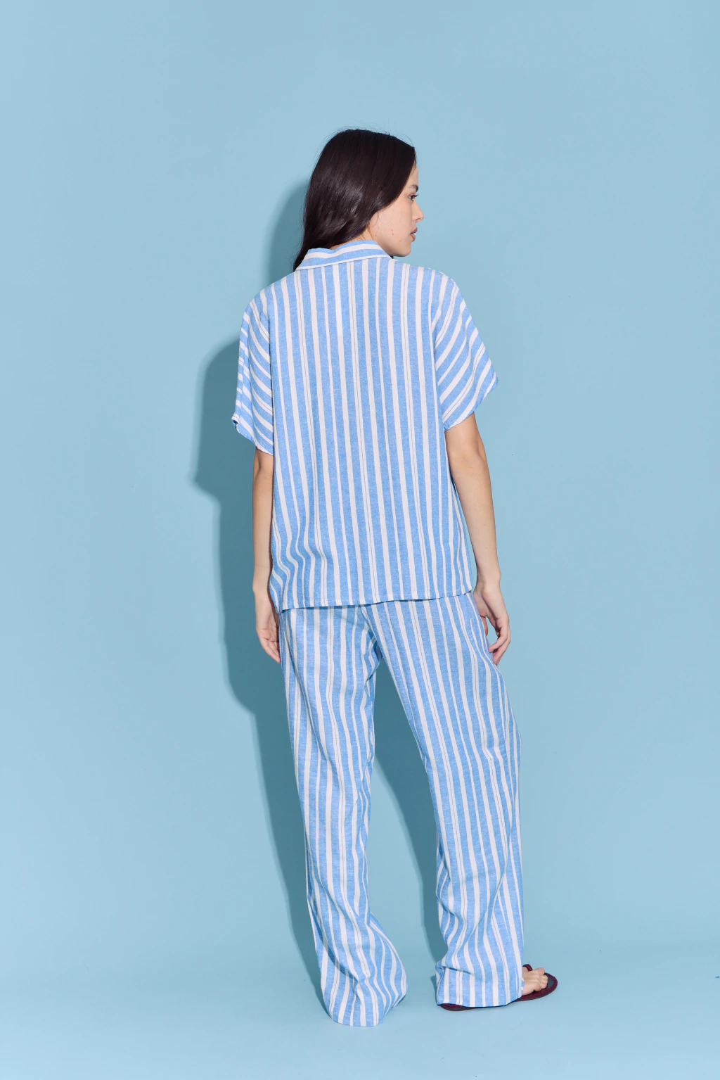 Camisa de manga corta con diseño rayado en tonos frescos y veraniegos. Confeccionada en una trama liviana y suave, ofrece un calce relajado que aporta comodidad sin perder estilo. Posee cuello clásico, botones frontales y aberturas laterales que suman movimiento. Ideal para usar sola o en conjunto con su pantalón haciendo match perfecto.