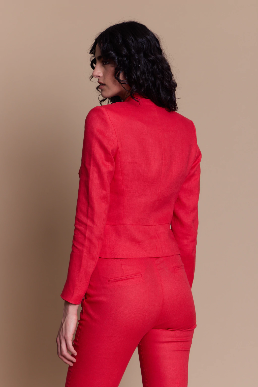 Chaqueta con cuello mao y acceso frontal con gancho, sin botones. Presenta recorte en cintura con falsos bolsillos con tapa recta y pinzas que realzan la silueta. De fit entallado, ideal para un look elegante y moderno.