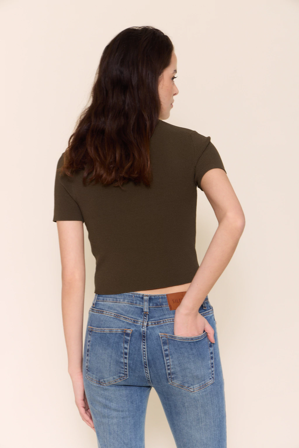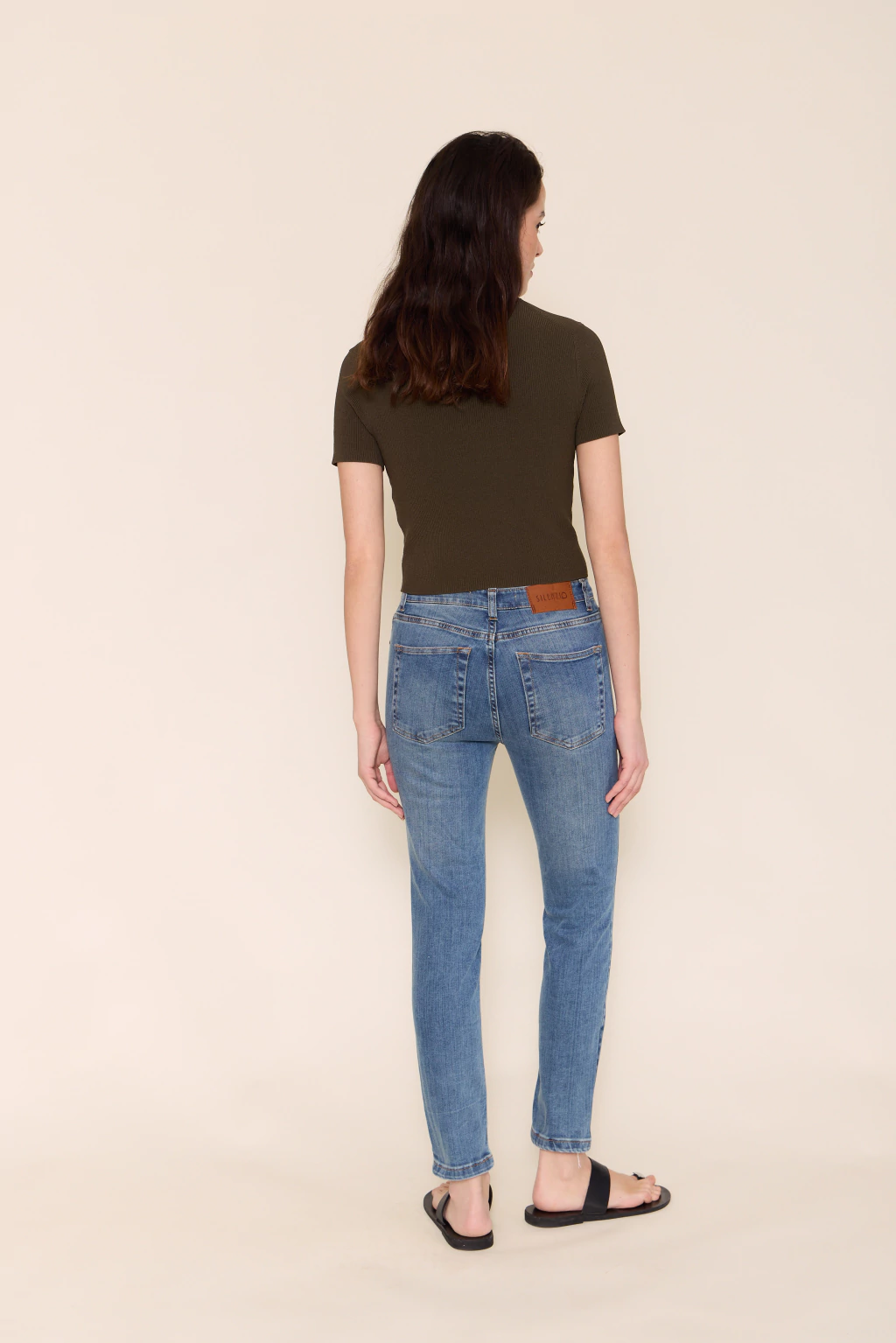 Jean tiro alto con lavado mid blue vintage y desgastados. Con elastano que brinda comfort y elasticidad. Fit skinny y largo al tobillo para un estilo moderno y ajustado.