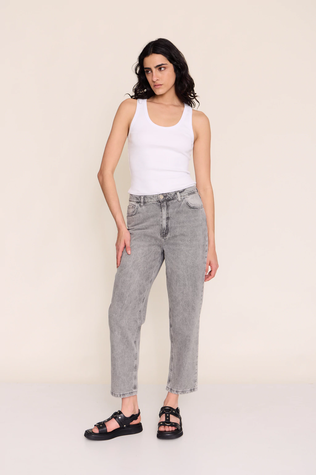 Jean 100% algodón, tiro medio con lavado light grey y desgastados. Fit straight y largo al tobillo para un estilo moderno y cómodo.