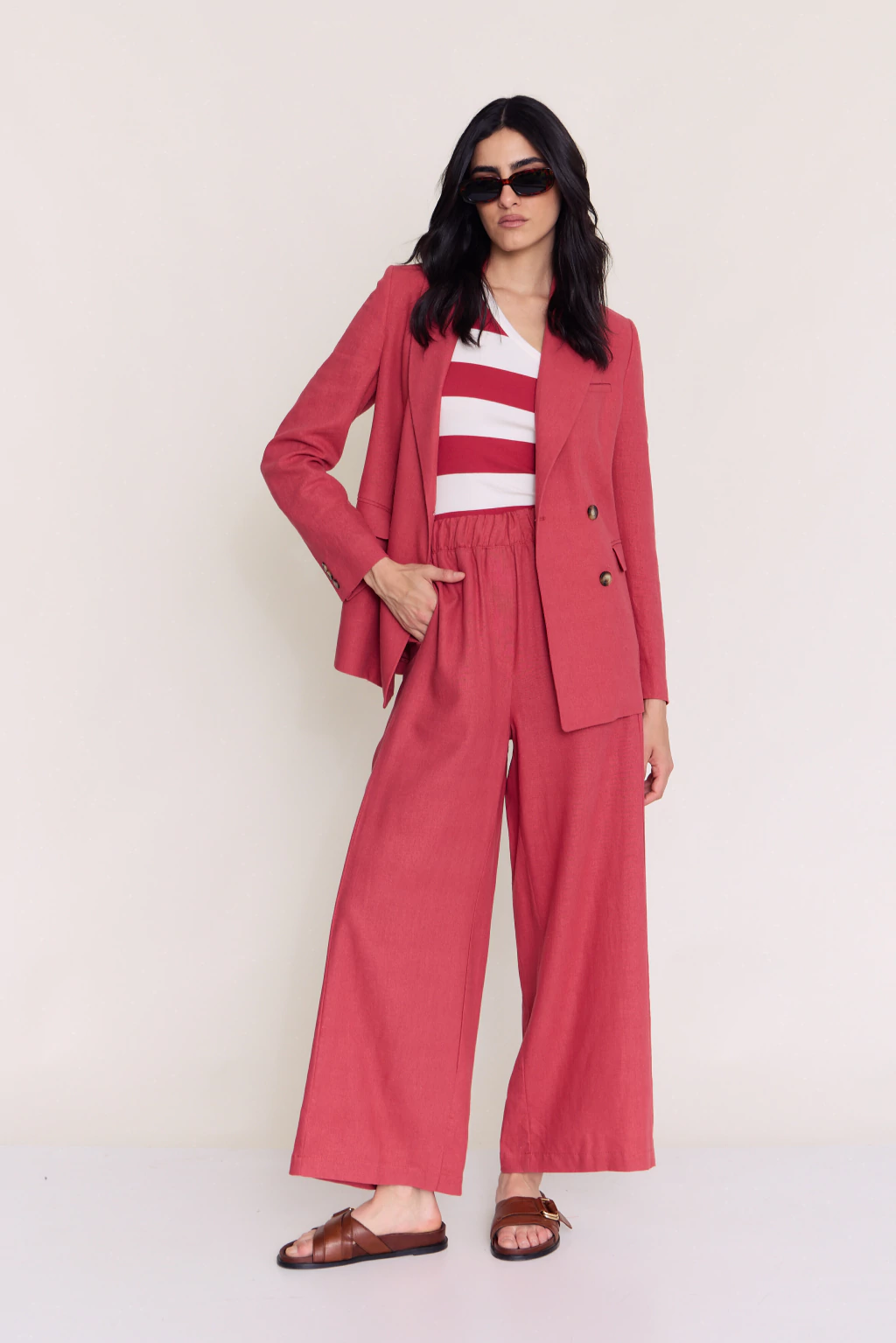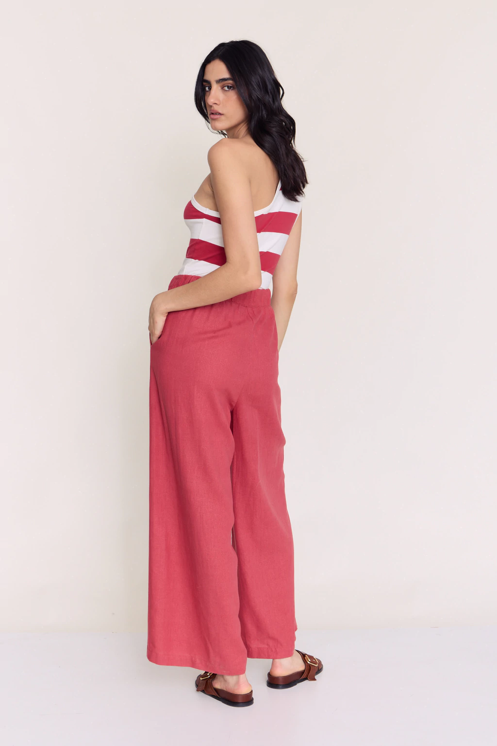 Pantalón palazzo fluido con cintura elástica y bolsillos, diseñado para aportar comodidad y practicidad. De fit holgado con caída amplia, ideal para un look elegante, moderno y versátil.