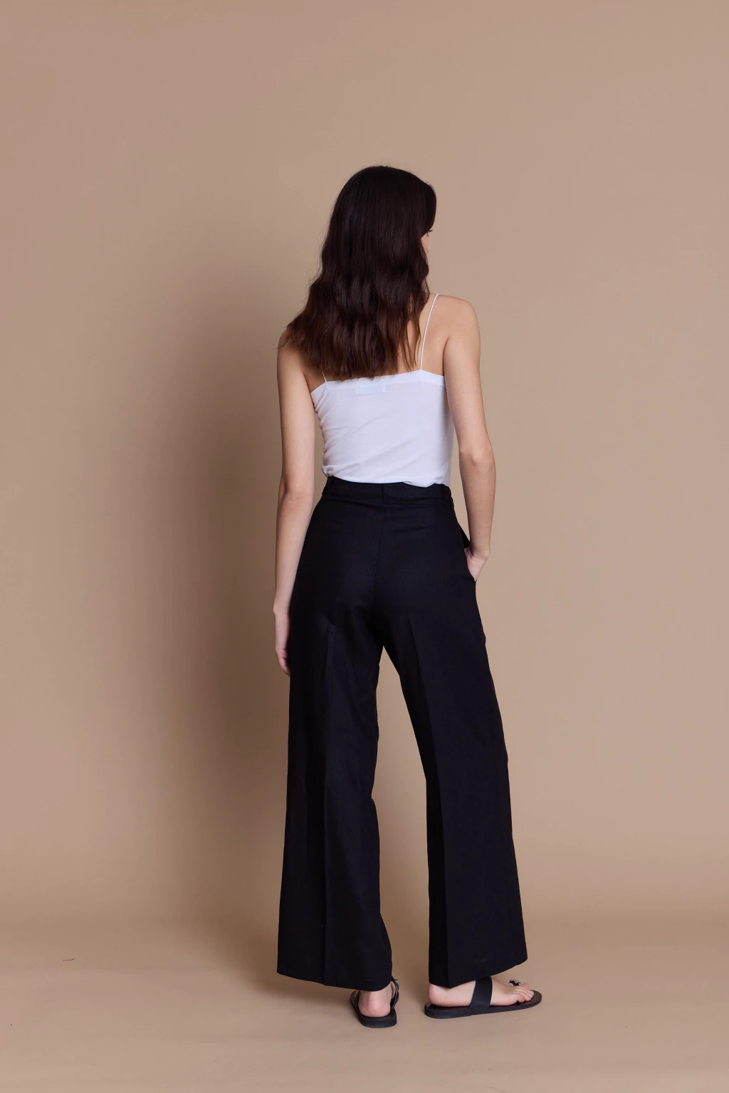 Pantalón de lino de tiro alto con bolsillos laterales y pinzas en el frente que aportan estructura. Cierre frontal clásico y fit holgado que brinda comodidad sin perder estilo. Una pieza liviana y natural, fiel a tu esencia.