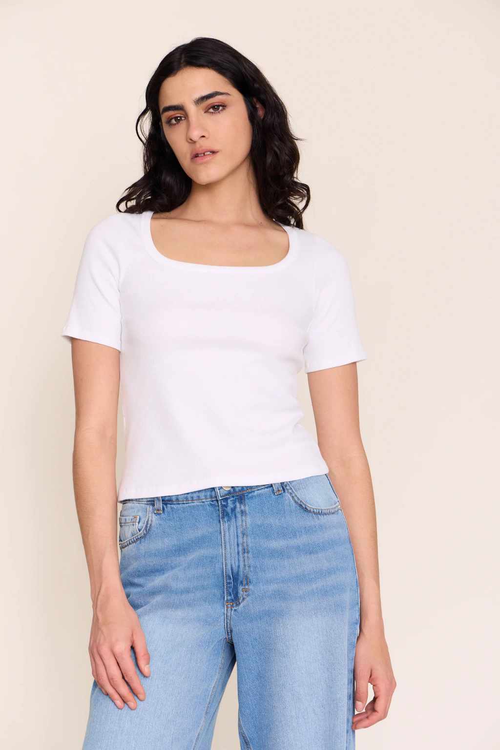 Remera de morley con escote cuadrado profundo y mangas al codo. Fit al cuerpo que resalta la silueta.