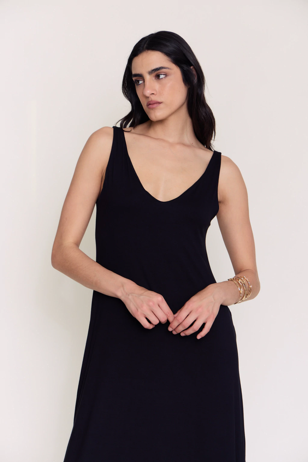 Vestido largo sin mangas con escote en v y tajos laterales. Fit holgado para un estilo fresco y moderno.
