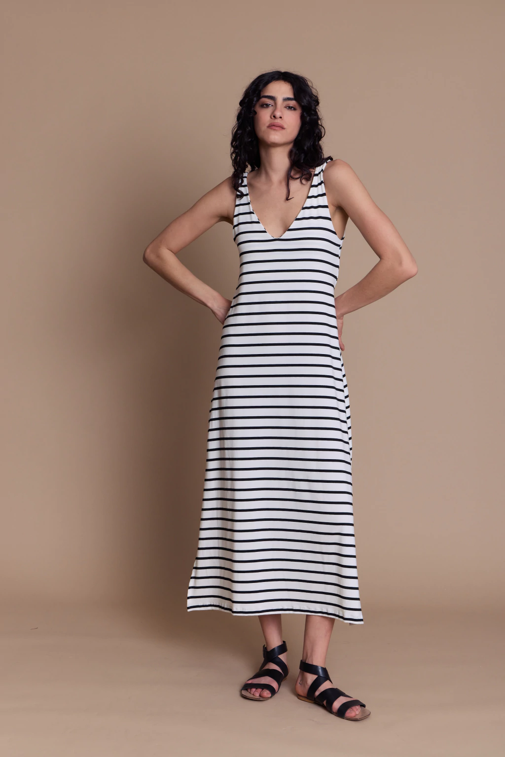 estido rayado largo sin mangas con escote en V, fresco y versátil. Presenta tajos en los laterales que aportan movimiento y comodidad. De fit holgado, ideal para un look moderno y relajado.