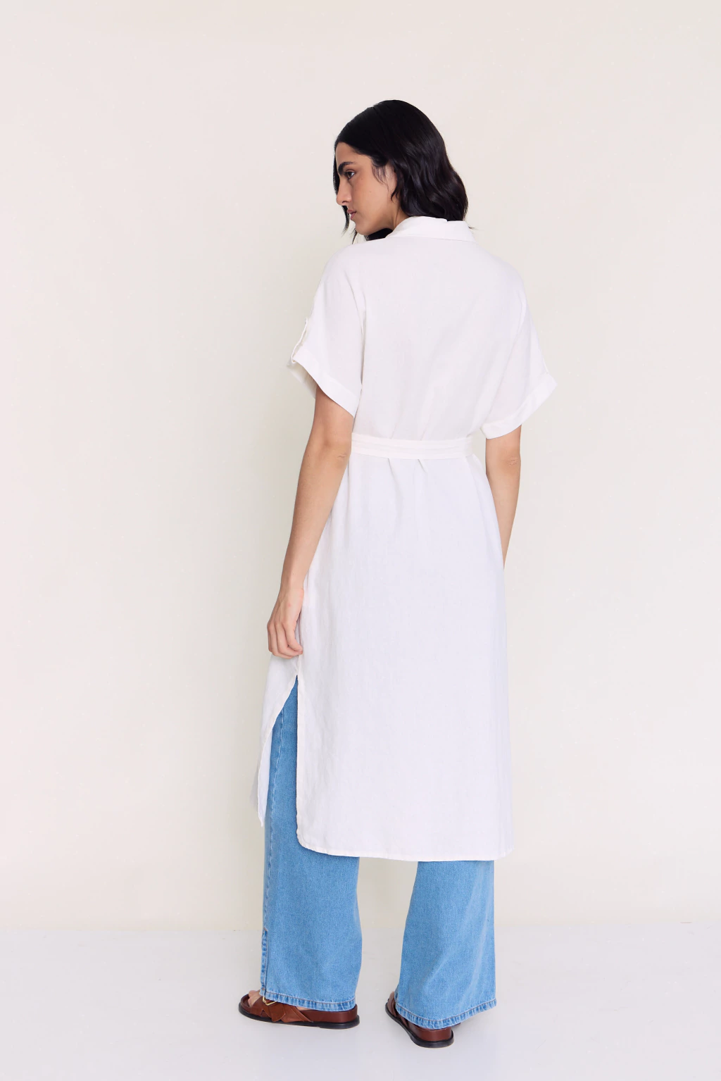 VESTIDO CAMISERO DE LINO CON CARTERA DE BOTONES. MANGAS CORTAS SIN SISAS CON MARTINGALA Y BOTÓN, LAZO EN CINTURA Y TAJOS LATERALES. ESTILO CÓMODO Y MODERNO.
