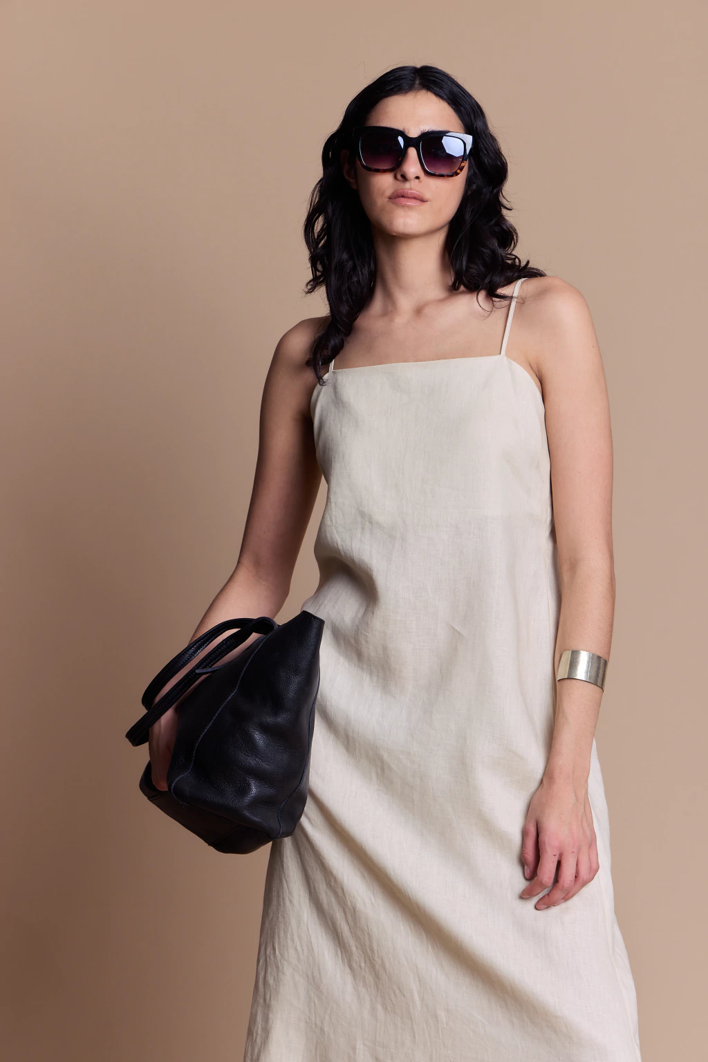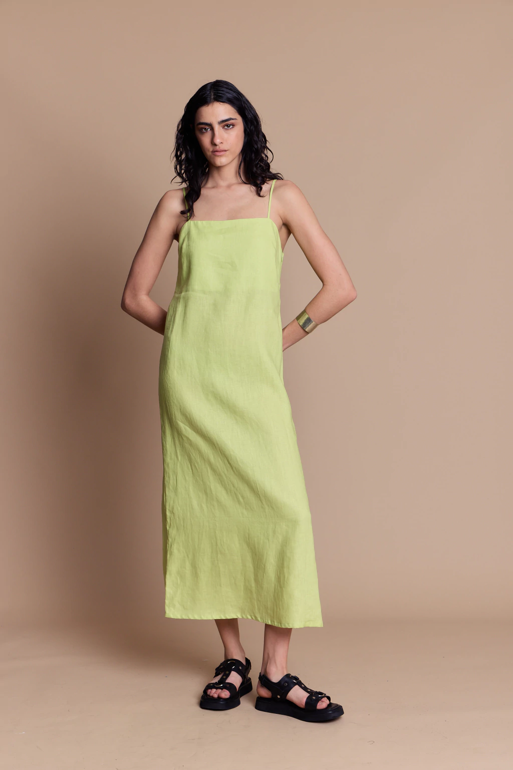Vestido de lino 100% con escote recto y breteles finos regulables, que permiten un ajuste personalizado. Largo midi con tajo en la espalda para mayor comodidad y libertad de movimiento. De fit recto, fresco y elegante, ideal para un look sofisticado y veraniego.