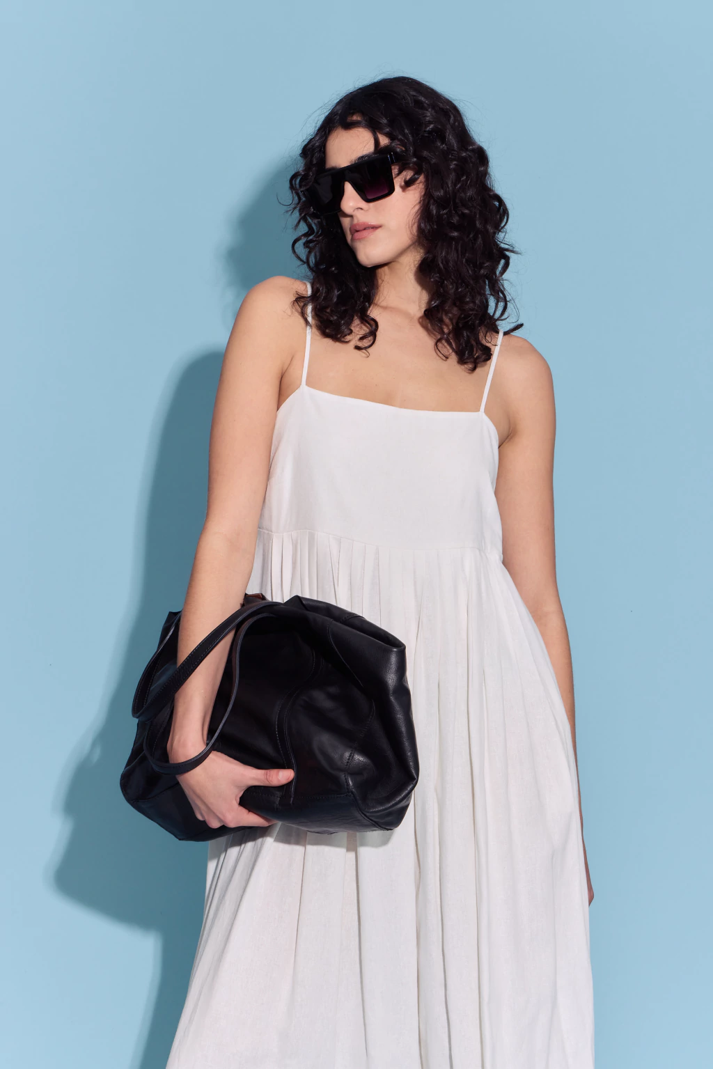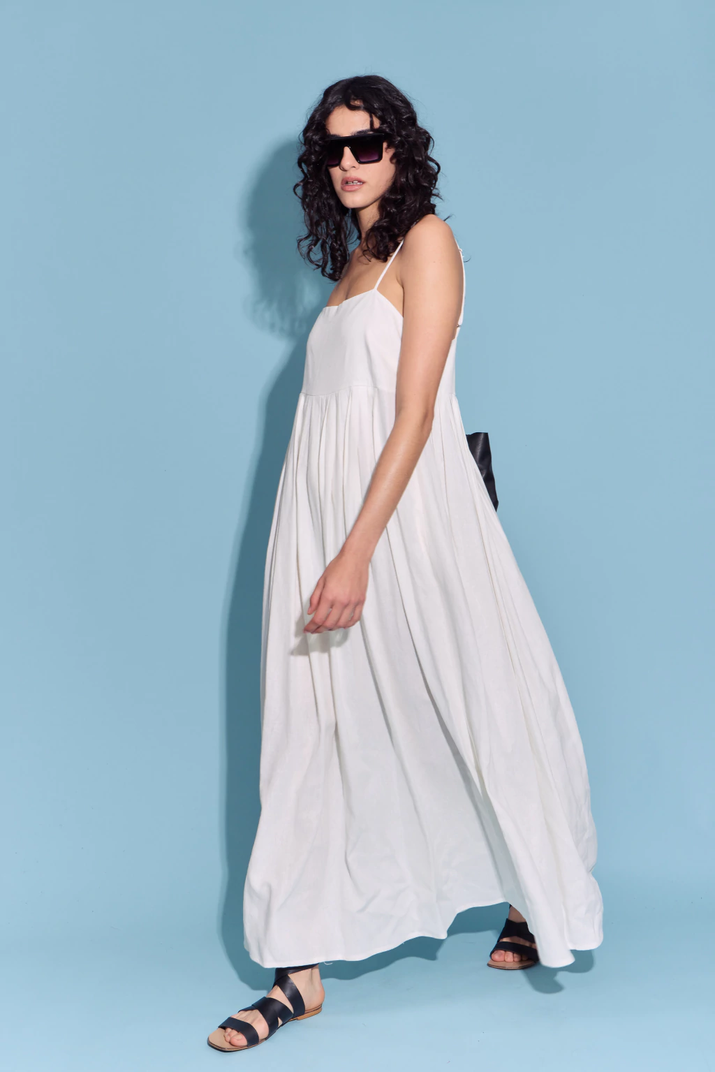 Vestido de lino con escote recto y breteles finos regulables. Recorte vertical en busto con tablas. Fit holgado para un estilo fresco y moderno.