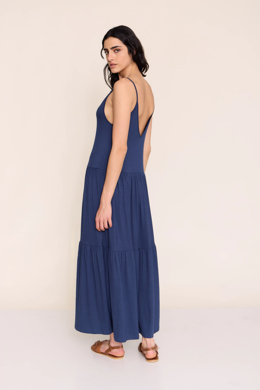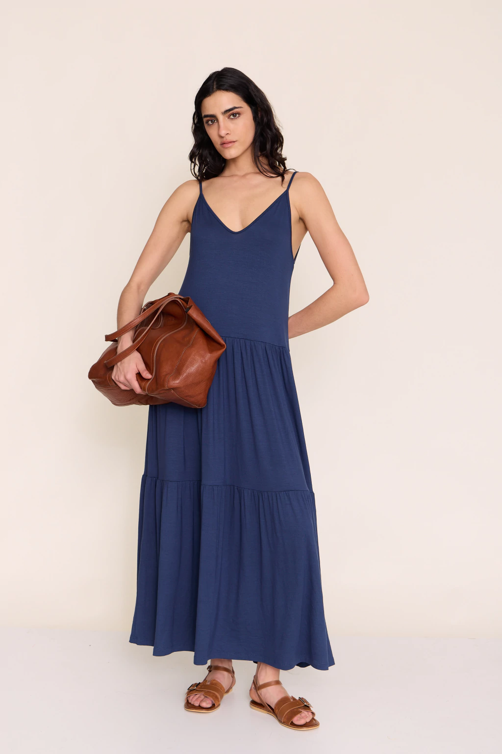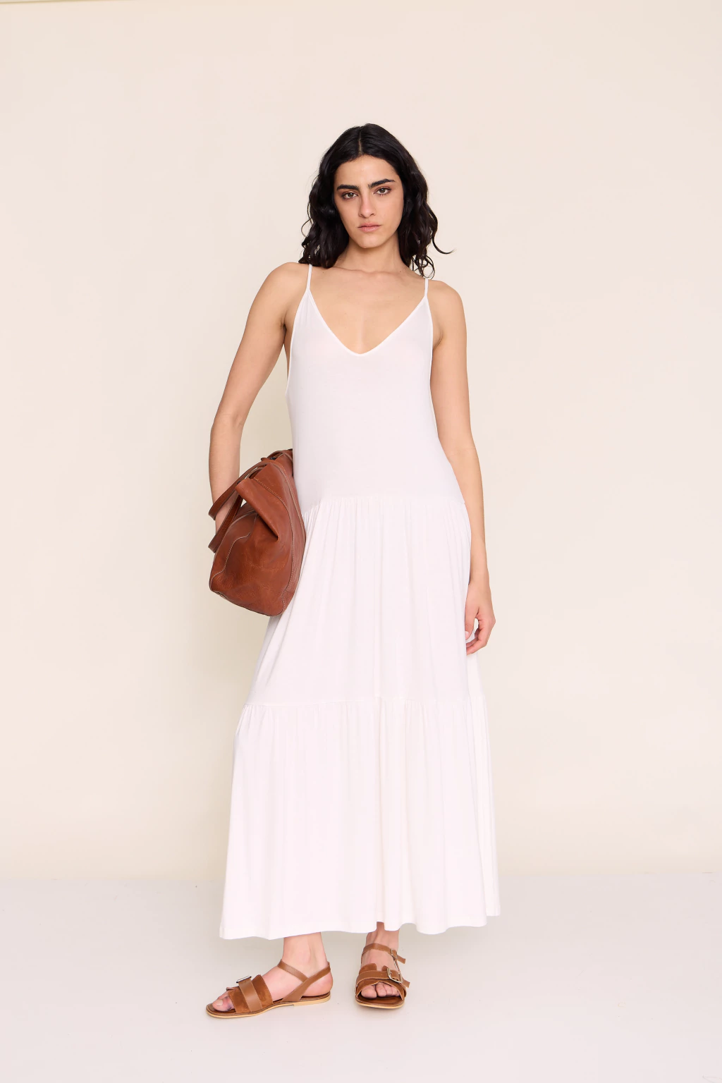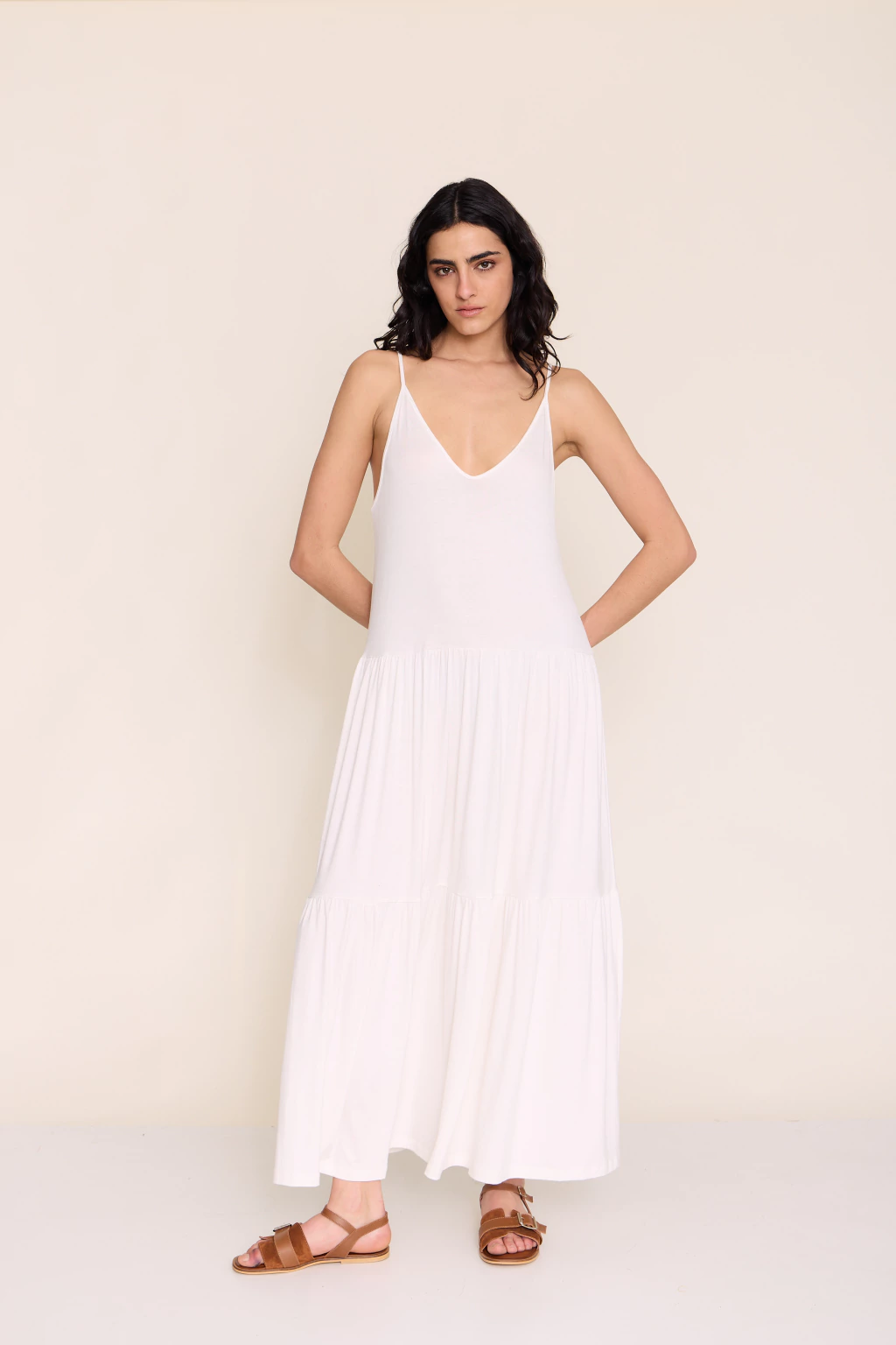 Vestido largo con breteles finos y escote en V, femenino y delicado. Presenta dos recortes horizontales con frunces que aportan movimiento y textura. De fit holgado con leve evasé, ideal para un estilo fresco, cómodo y moderno.